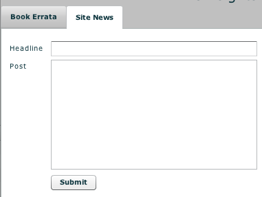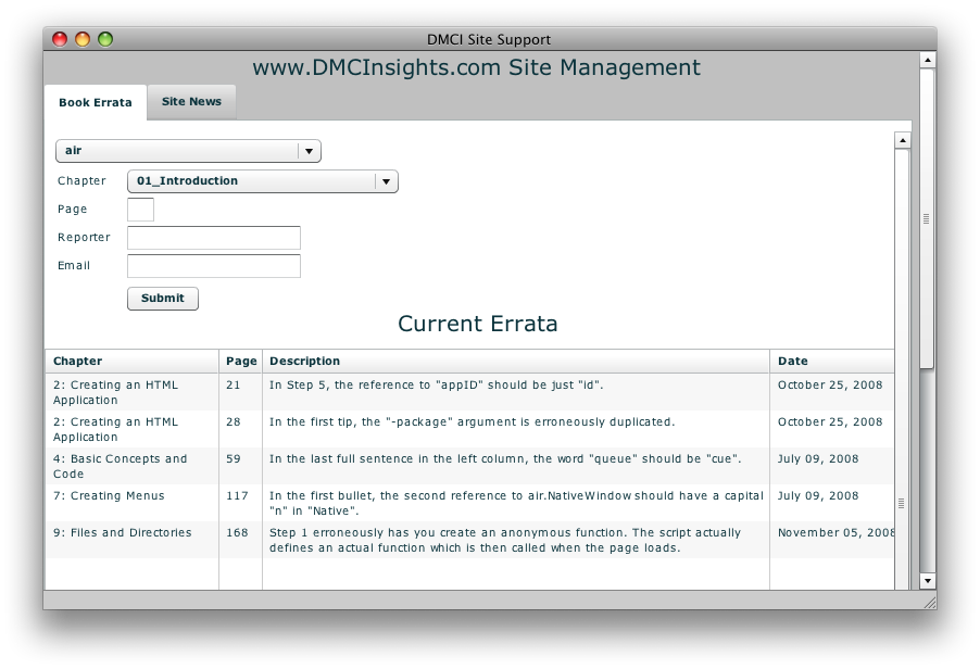 \[caption id="attachment\_209" align="aligncenter" width="381" caption="The application's two tabs."\]\[/caption\]The most important part of the application is the errata management. This is a multistep process. First I need to select the book involved, then I need to update the list of chapters for that book. I thought it’d also be a nice feature to show the current errata. For the HTML version of the application, I had already created a PHP script that sends the list of errata in XML format. I tied into this in my Flex version using an HTTPService object. Then a DataGrid object automatically turns the XML into a table. After editing one thing in the DataGrid’s configuration, this table immediately because sortable, which is a nice feature not easily added to the HTML version of the table I had previously made. Here’s what the errata management looks like: