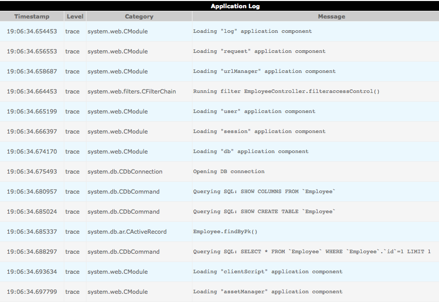 There are a couple of ways you can configure how your Yii application behaves. For the most part, you’ll do this through the protected/config/main.php file, but first I want to talk about the index.php file, created in the root of your Web application directory. This is a “bootstrap” file, meaning that all user interactions actually go through it. For example, showing an employee record might be through the URL www.example.com/index.php/employee/show/id/34 and updating a department record might involve submitting a form to www.example.com/index.php/department/update/id/3. Both URLs request just that one PHP script.