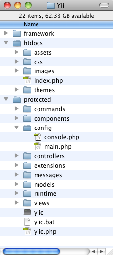 Most of the configuration occurs in the main.php configuration file, found within the protected/config directory (see the above image). There’s also a console.php config file, but that’s for a command-line version of the application. I won’t discuss that here, but you would edit it if you have command-line scripts associated with your application.