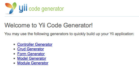 Assuming you understand all of the above and have taken the requisite steps, you should now load Gii in your browser. Assuming your site is to be found at www.example.com/index.php, the Gii tool is at www.example.com/index.php/gii/. This assumes you’re using the URL management component in Yii. If not, head to www.example.com/index.php?r=gii. You should be taken to the login screen, where you just enter the Gii password (established in the configuration file), and click Enter. Assuming you entered the correct password, you’ll see a splash page and a list of options (as links).