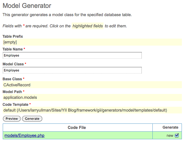 - Enter Employee as the Model Class. You’ll notice that the form automatically copies the table name as the Model name.