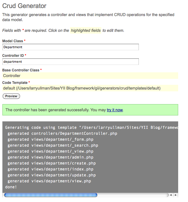 You should then see a message indicating that the code was created. Again, if you see an error about an inability to write the file, you’ll need to modify the permissions on the protected/controllers and protected/views directories to allow the Web server to write there. Once this works for you, repeat the process for the Department Model. The resulting page will also offer up a link to go test the generated files.
