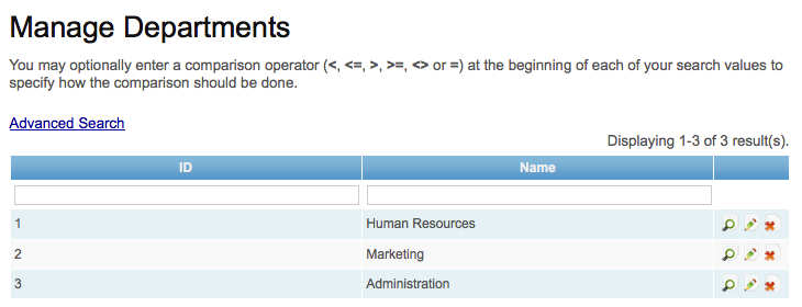 The index and admin Views both show multiple Model records, using Zii widgets. index.php uses the CListView widget, using the _view.php script as the template. If you edit either _view.php or how CListView is configured (in index.php), you’ll change the listings. The admin page, accessed by clicking on “Manage XXX”, uses the CGridView widget. This widget creates a table of data, with links to view, edit, or delete specific records. The table can be paginated and searched, using Ajax. It’s really sharp and a great demonstration of how much Yii will do for you. This figure shows the departments listing, without having made any changes to what Yii created: